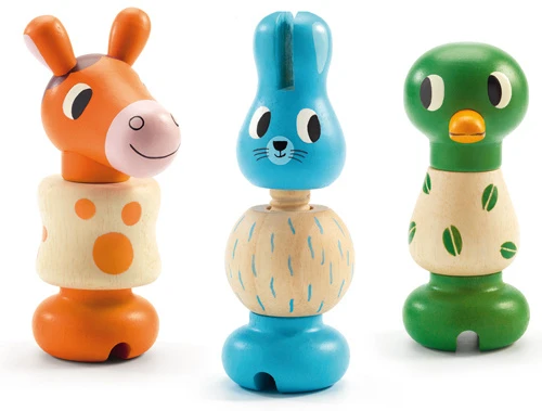 3 animaux en bois à visser et dévisser pour développer la dextérité des tout-petits.